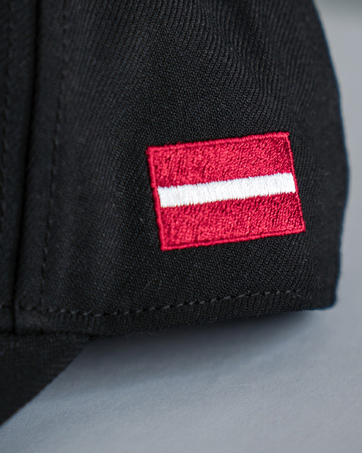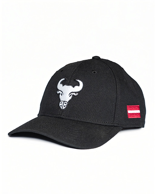 Melna cepure BULLSFITNESS ar liekto galu un Latvijas karogu kreisajā sānā